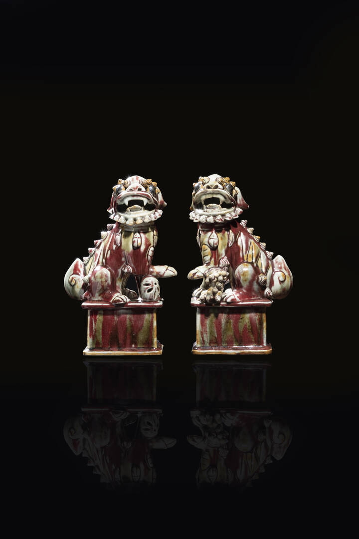 Coppia di cani di Pho in porcellana flambč Cina dinastia Qing XIX sec. H cm 26x18