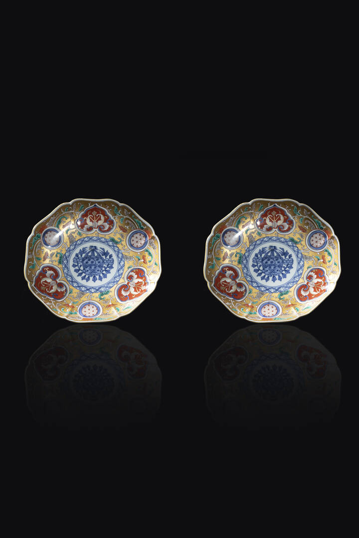 Coppia di piatti in porcellana con decori floreali Giappone Imari XIX sec. Diam cm 24 5