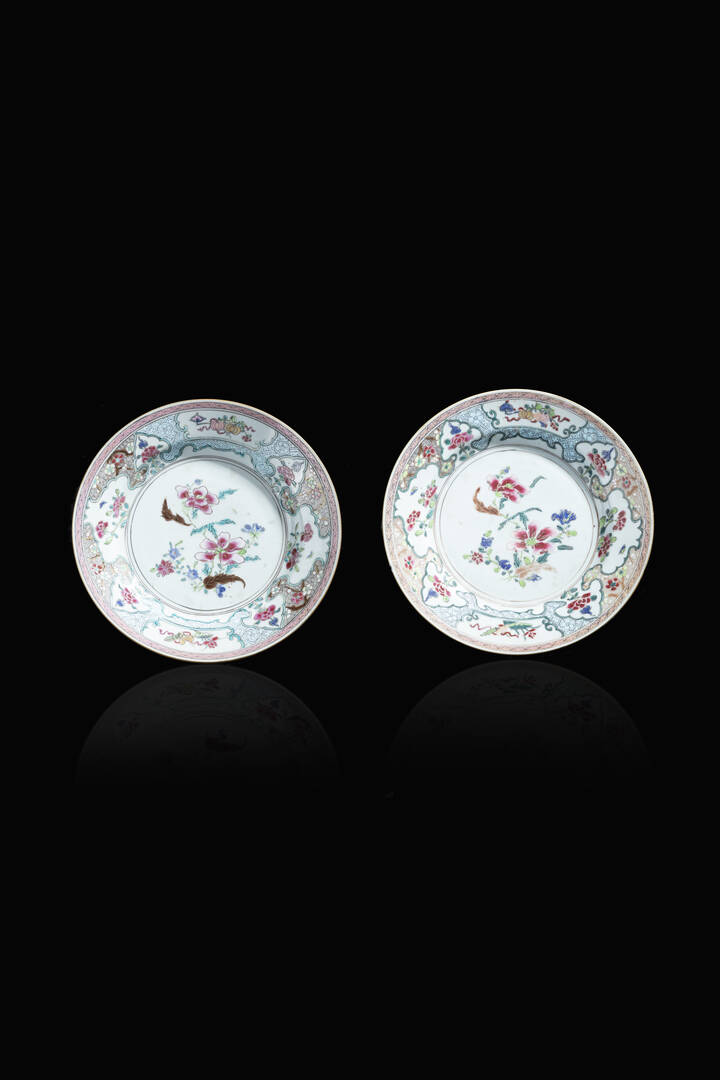 Coppia di piatti in porcellana Famiglia Rosa Compagnia delle Indie Orientali Cina XVIII secolo. Diam. cm 23