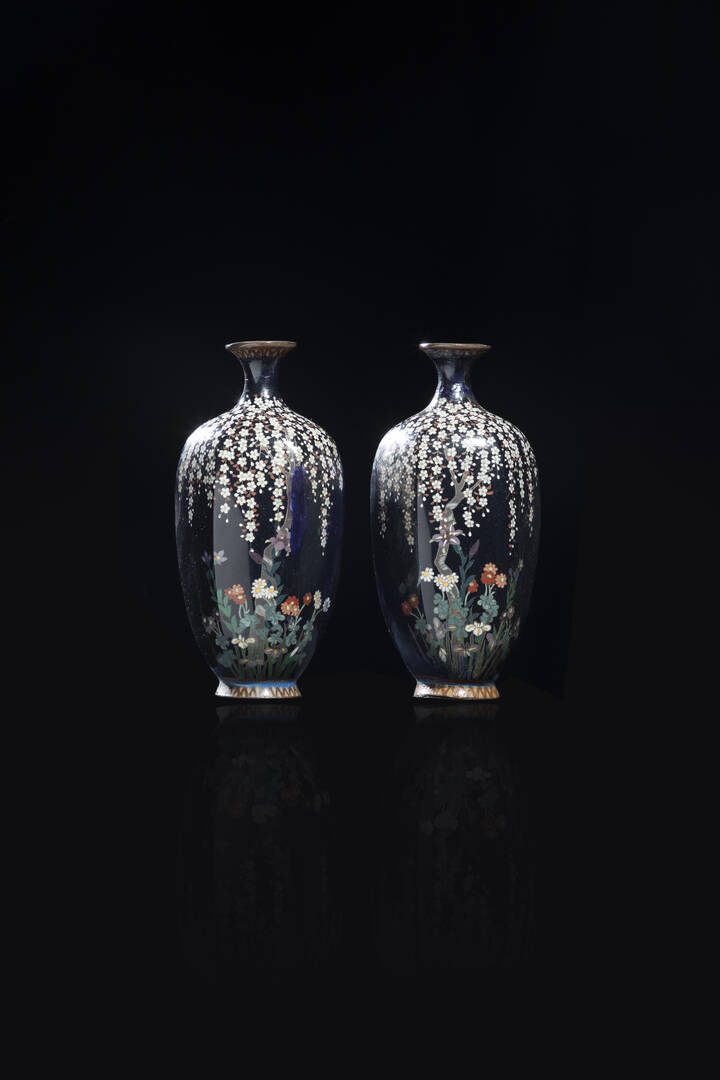 Coppia di piccoli vasi in smalti dipinti con fiori di ciliegio Giappone fine XIX [..]
