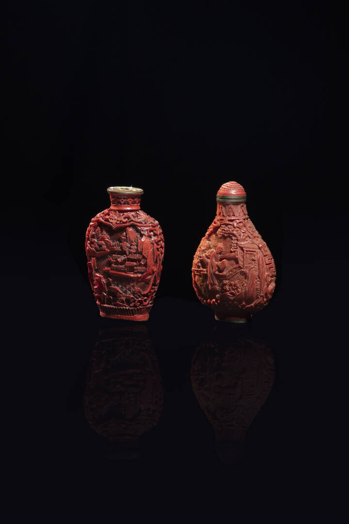 Coppia di snuff bottle in lacca con paesaggi e figure Cina dinastia Qing XIX [..]