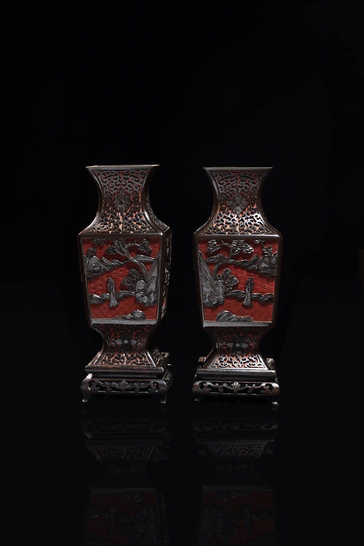 Coppia di vasi in lacca intarsiati con personaggi entro paesaggio Cina XX sec. H cm 24x10