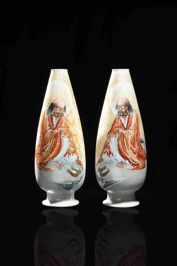 Coppia di vasi in porcellana dipinti con Lohan e iscrizioni Cina Repubblica XX sec H cm 30x11