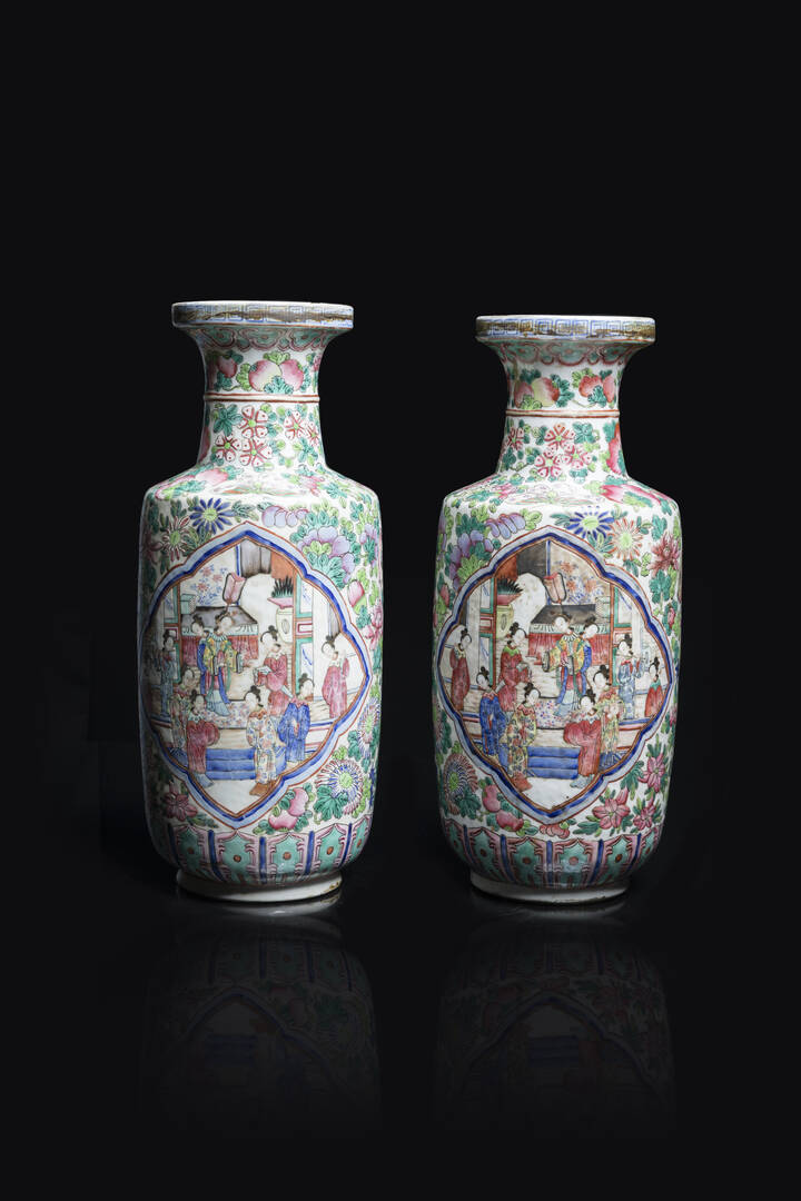 Coppia di vasi in porcellana Famiglia Rosa dipinti con scene di vita quotidiana [..]