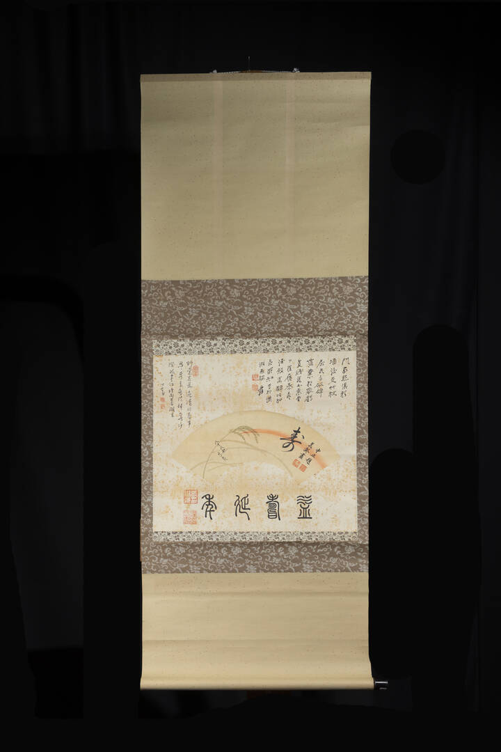 Dipinto su pergamena con iscrizioni e ventaglio Cina Repubblica XX sec H cm 36x40 5 dipinto H cm 123x46 scroll