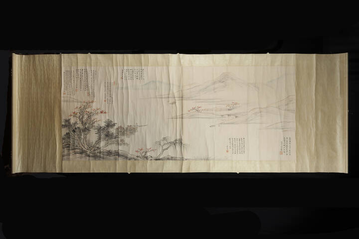 Dipinto su pergamena con paesaggi e iscrizioni Cina Repubblica XX sec. H cm 63x156 dipinto H cm 79x223 scroll