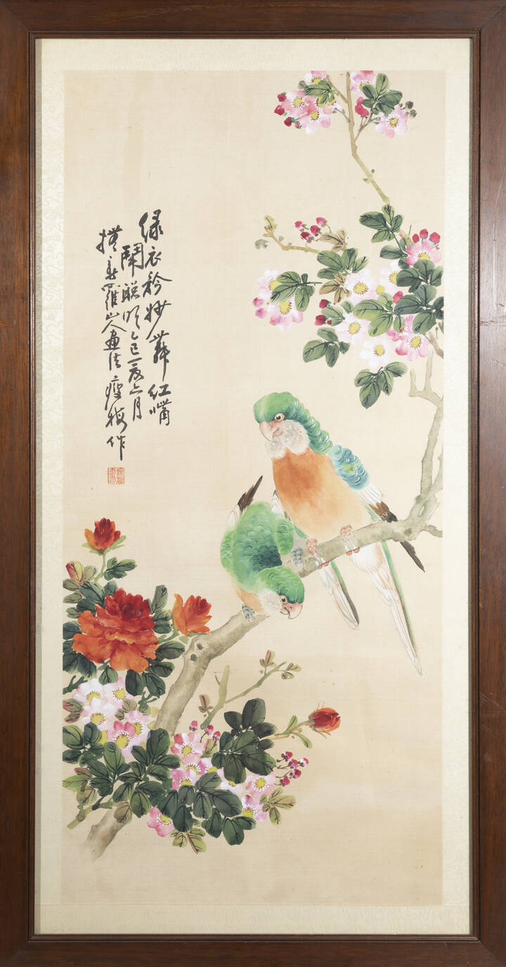 Dipinto su pergamena raffigurante pappagalli e iscrizioni Cina Repubblica XX [..]