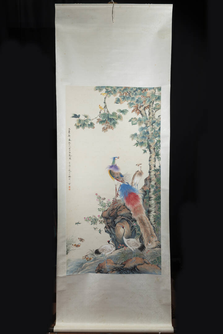 Dipinto su pergamena rappresentante pavoni e uccelli Cina Repubblica XX sec. H cm 137x76 dipinto H cm 235x83 scroll