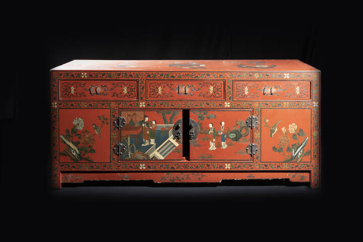 Mobiletto in lacca rossa dipinto con figure entro paesaggio (uccelli e vasi) Cina Repubblica XX sec. H cm 48x109x38