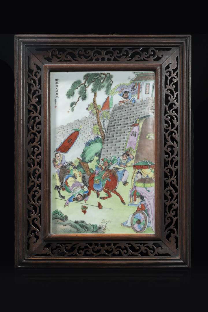 Placca in porcellana Famiglia Rosa rappresentante scene di battaglia con cornice in legno Cina Repubblica XX sec H cm 41.5x54.5 H cm 24x38 placca