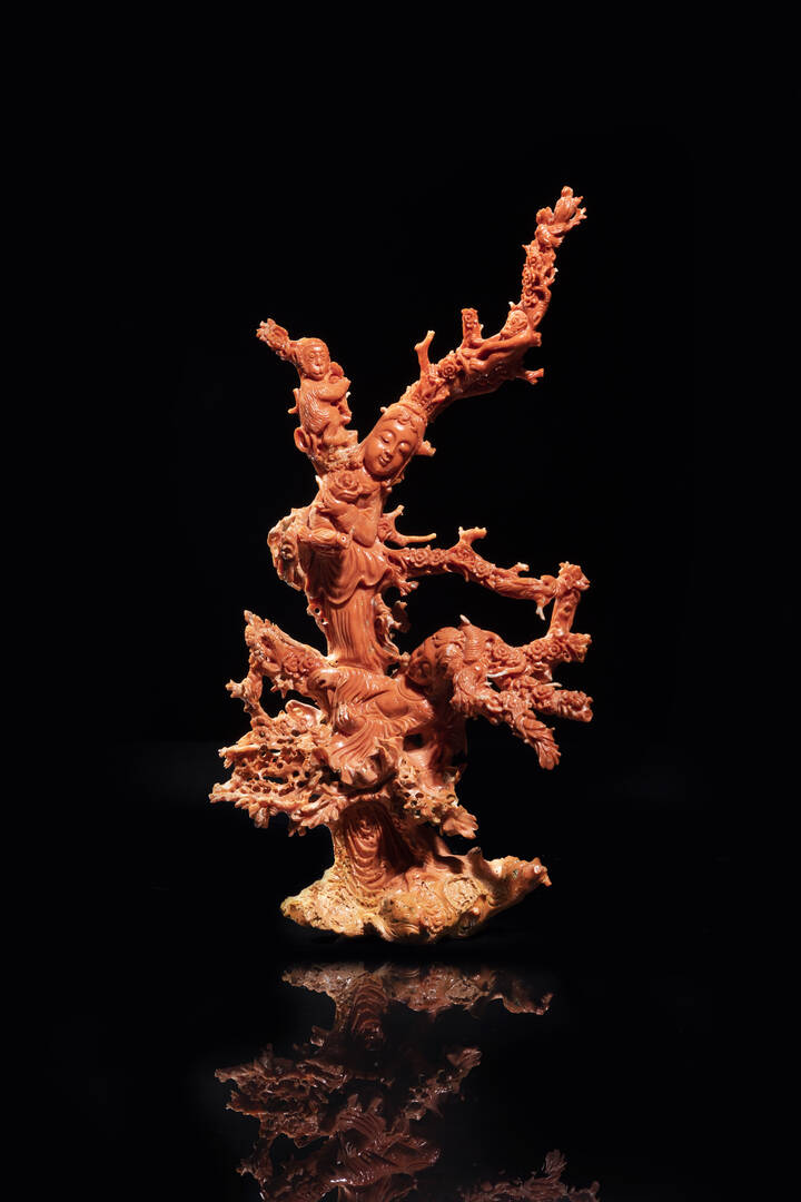 Ramo di corallo finemente scolpito con figure di guanyin e scimmie Cina dinastia [..]