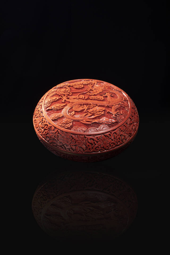 Scatola in lacca con drago Cina XX sec. H cm 10 Diam cm 20 5