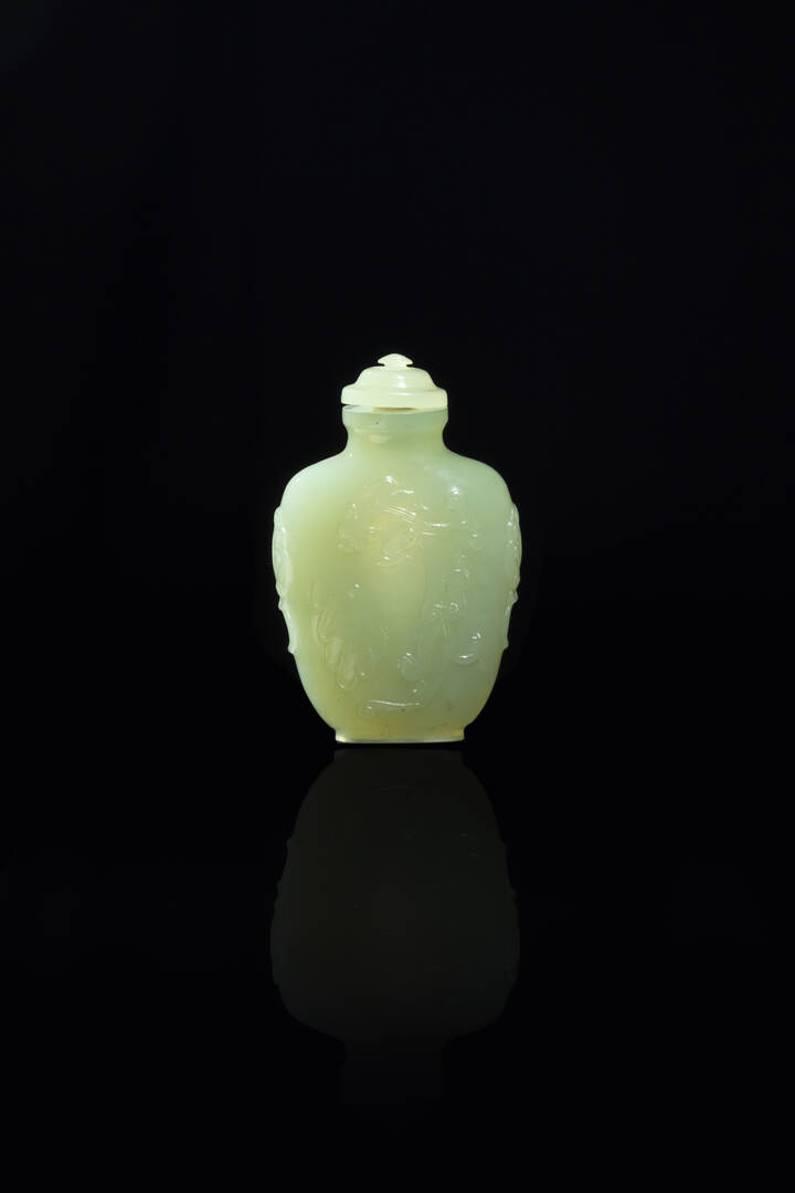 Snuff bottle in giada celadon intarsiata con animale fantastico Cina Repubblica XX sec. H cm 8x5