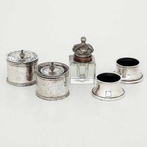 Due coppie di bussolotti da scrittura in argento e un calamaio in metallo e vetro. [..]