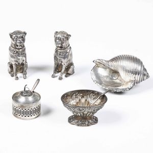 Lotto di saliere tra cui una saliera con conchiglia ed una con vetro blu in metallo [..]
