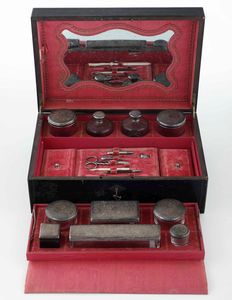 Servizio da viaggio per toilette in metallo argentato entro custodia in legno. Italia [..]