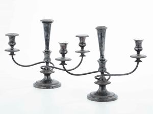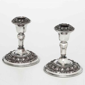 Coppia di piccoli candelieri in metallo argentato. XX secolo