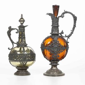 Due brocche in metallo argentato e vetro colorato. XIX secolo