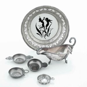 Lotto di una salsiera, tre ciotole, un tastevin in peltro e metallo argentato e [..]