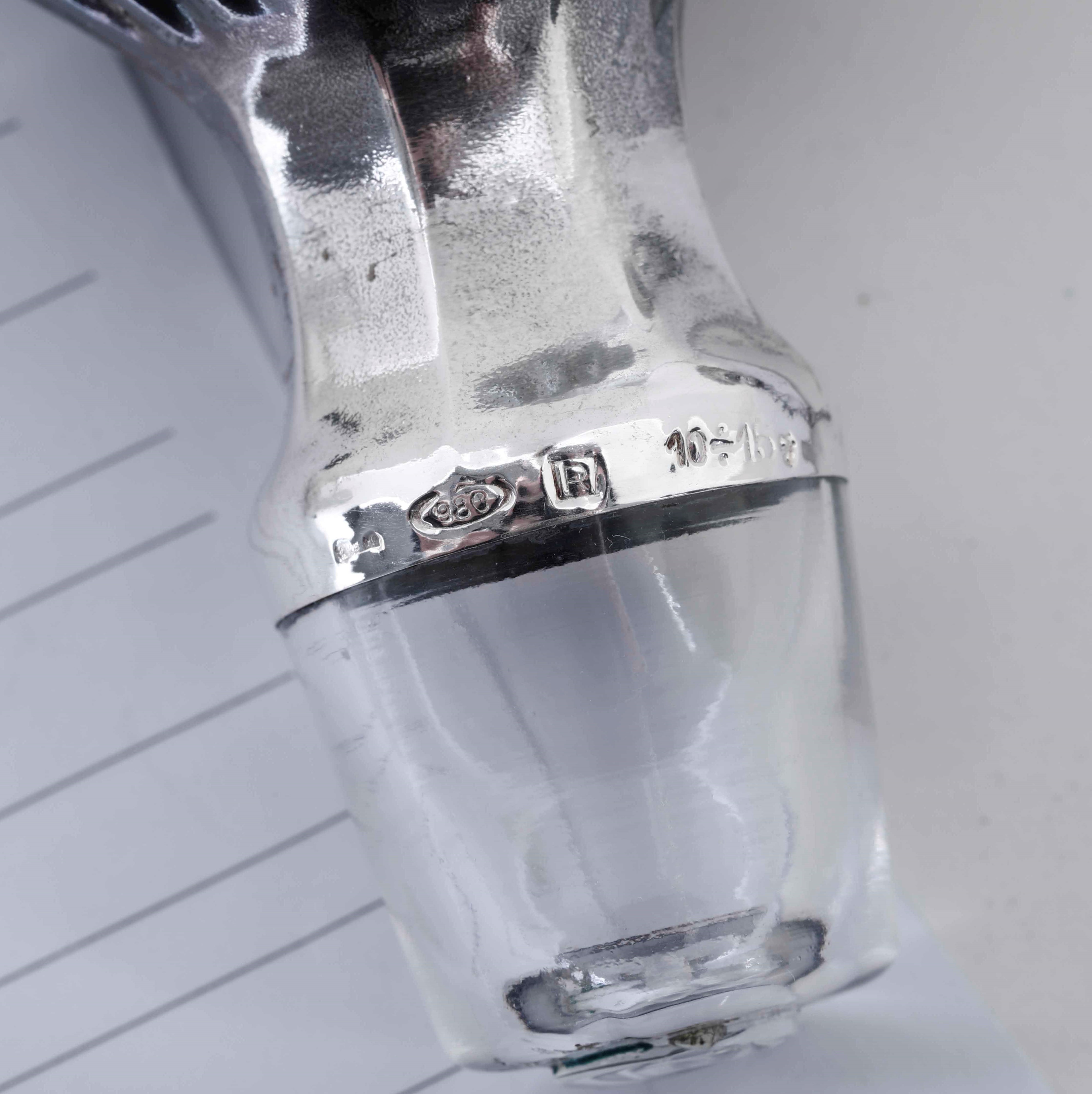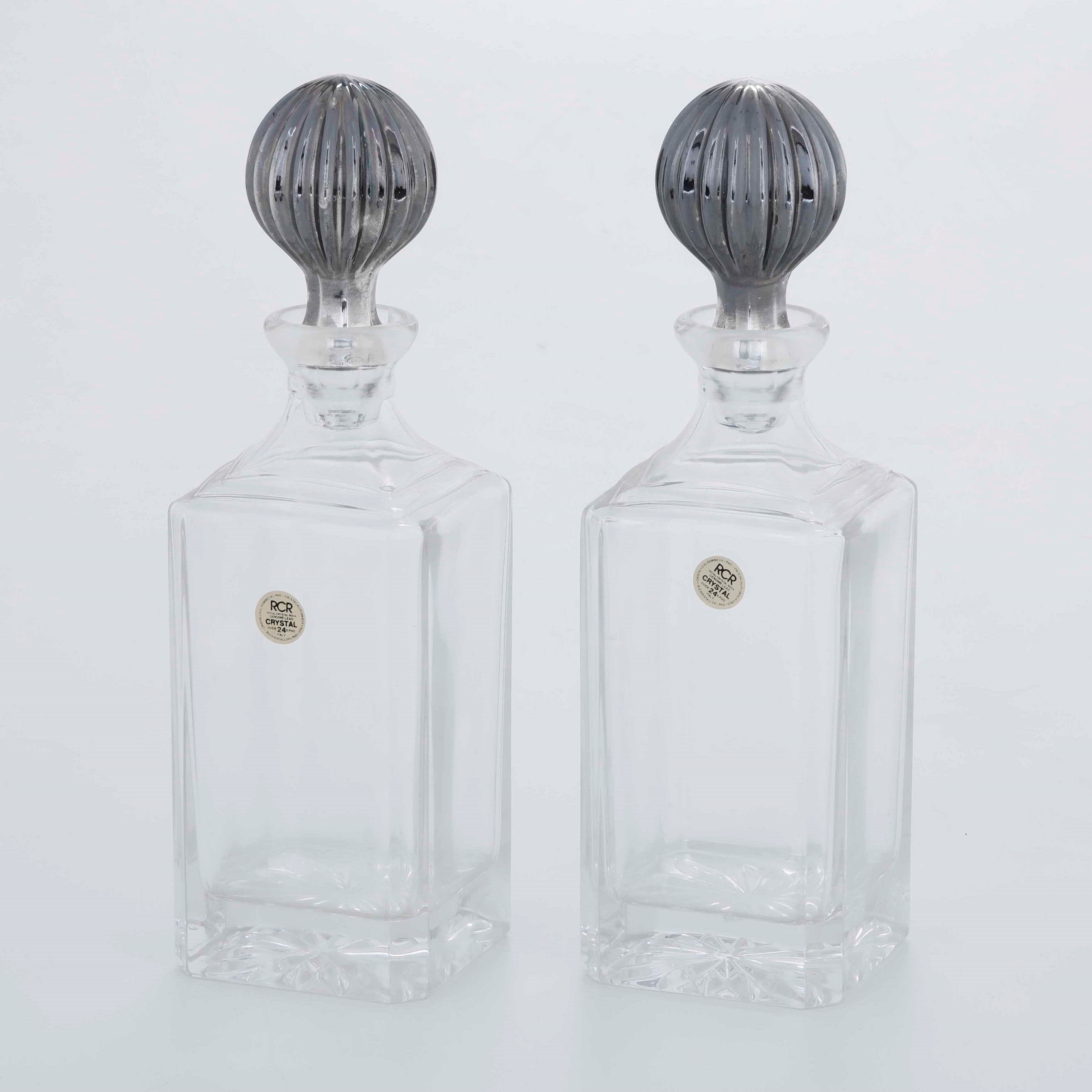 Coppia di bottiglie in cristallo con tappi in argento. Italia XX secolo