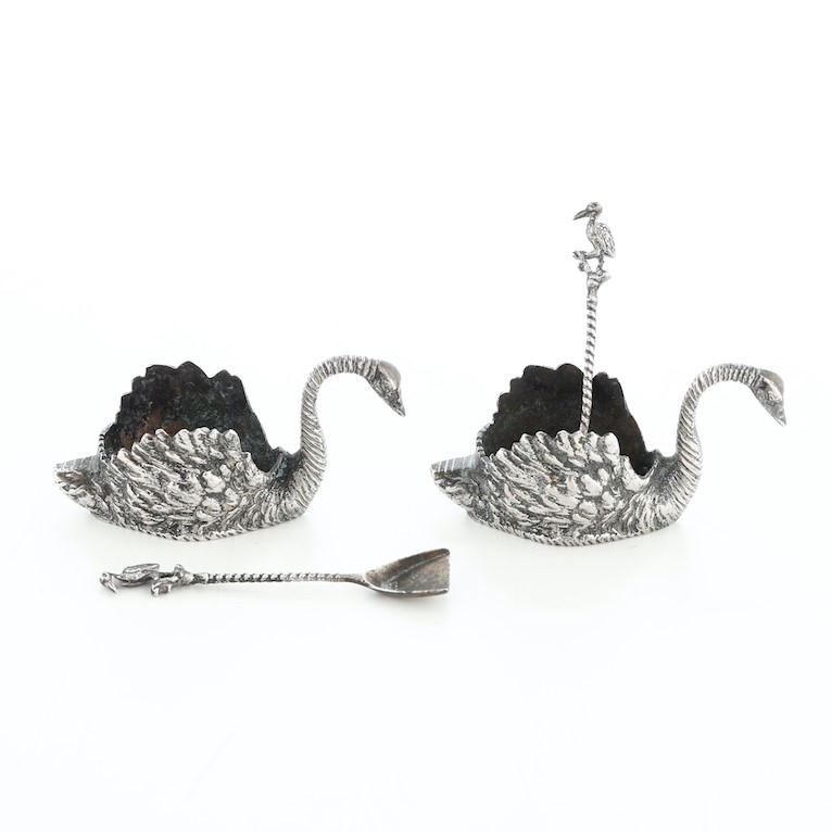 Coppia di salierine a foggia di cigni in argento fuso e cesellato. Argenteria artistica [..]