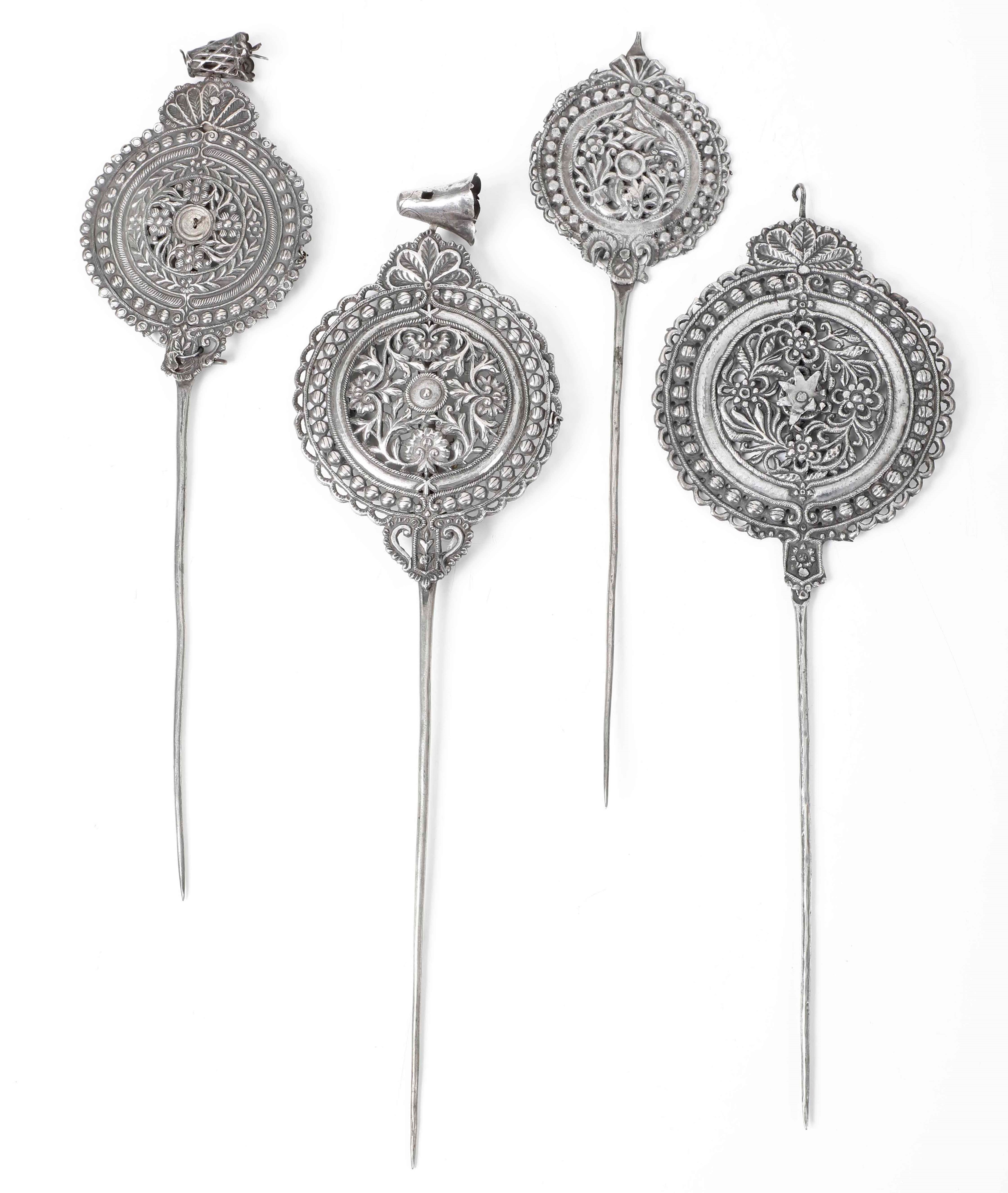 Insieme dě quattro spille (Tupu) in argento sbalzato, traforato e cesellato. Arte [..]