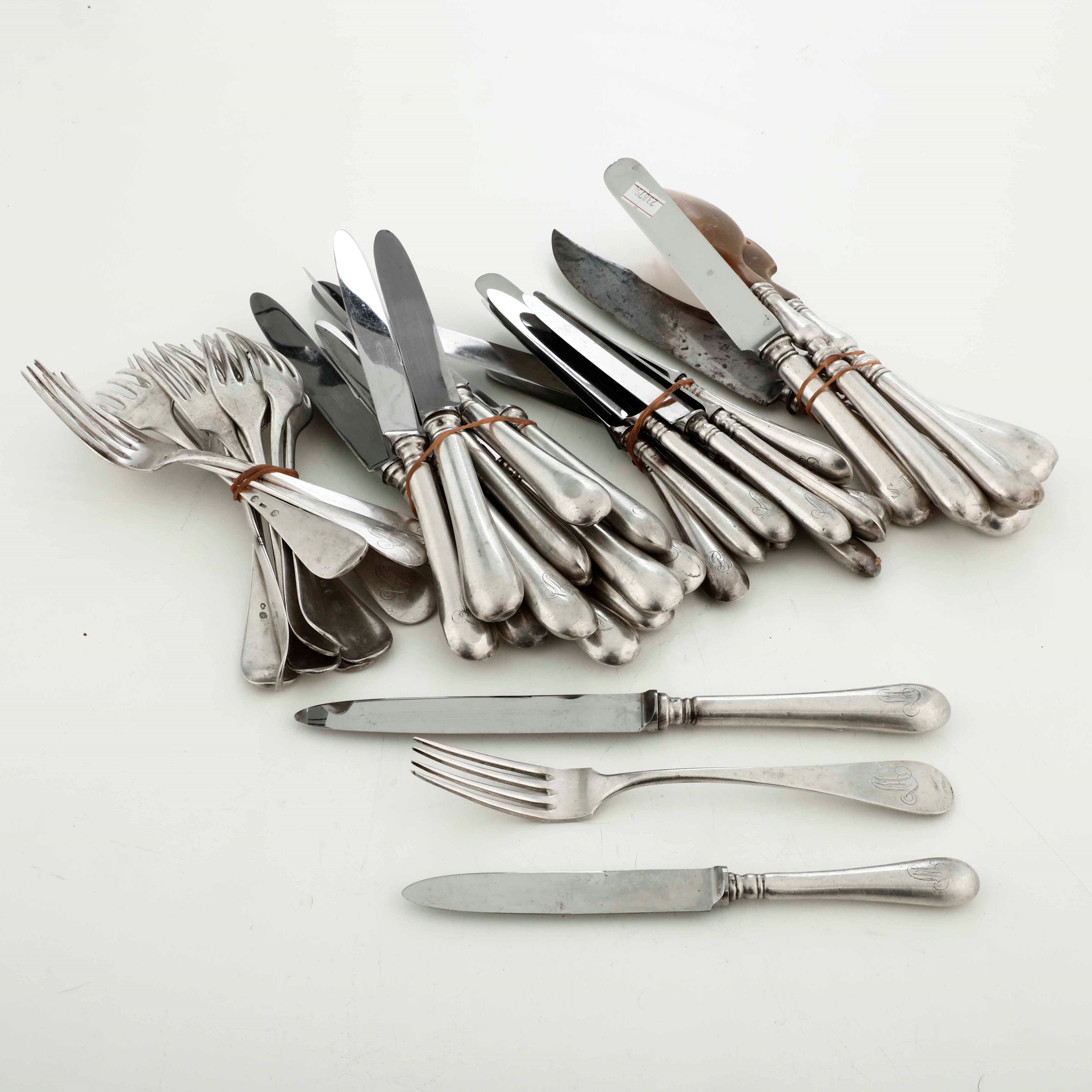 Lotto composto da 4 posate da portata, 12 forchette, 12 coltelli, 11 coltelli da [..]