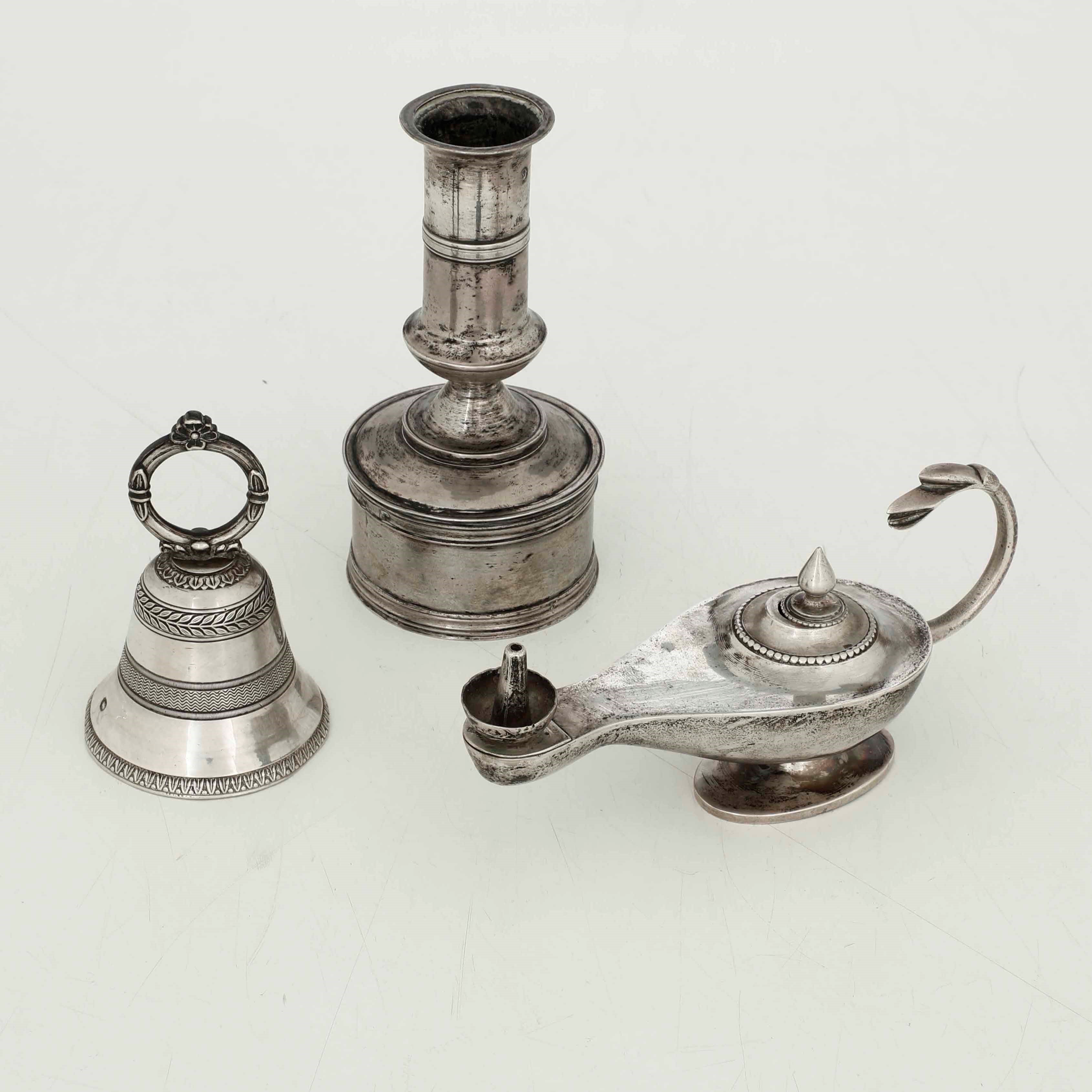 Lotto composto da una lampada ad olio, un portacandela e una campanella in argen [..]