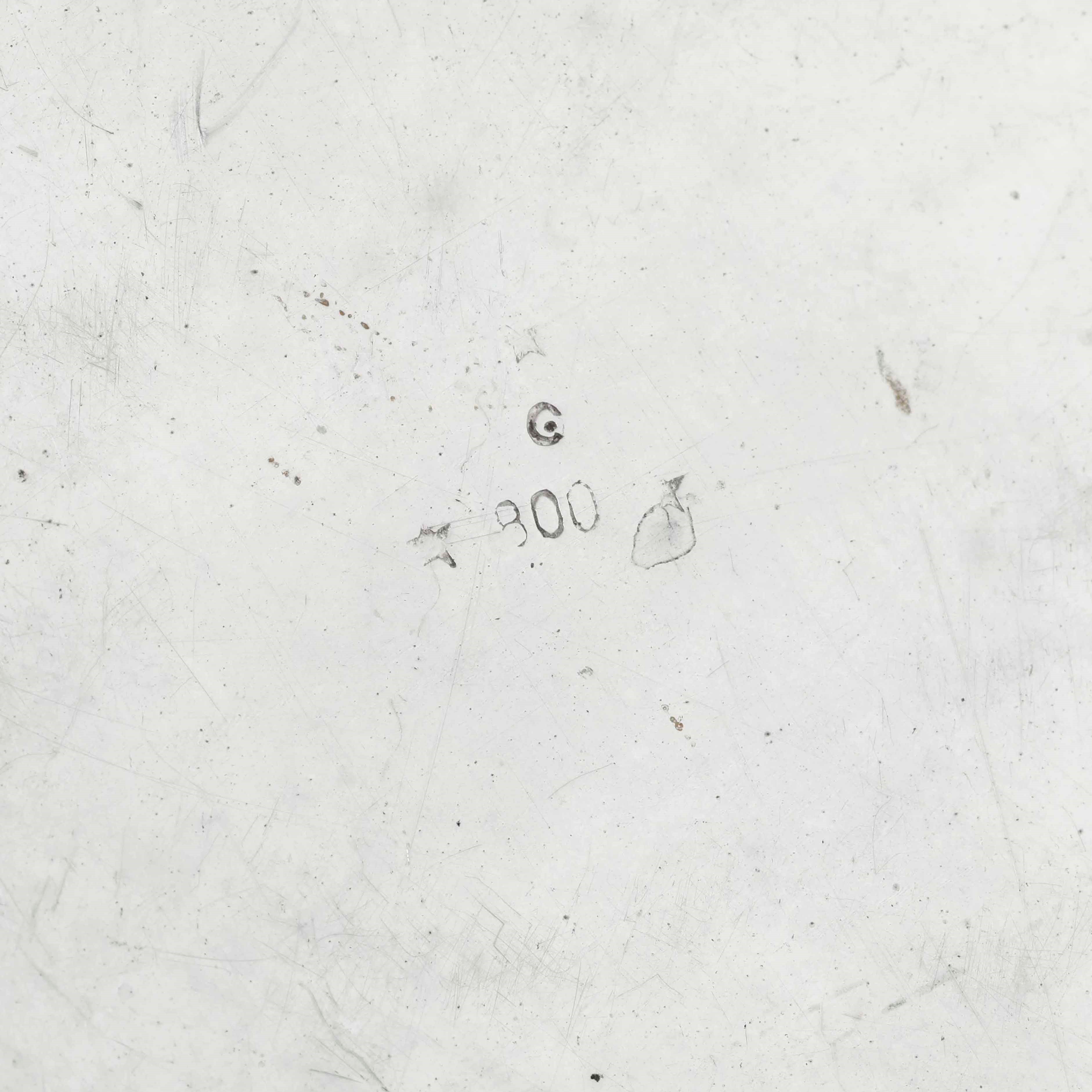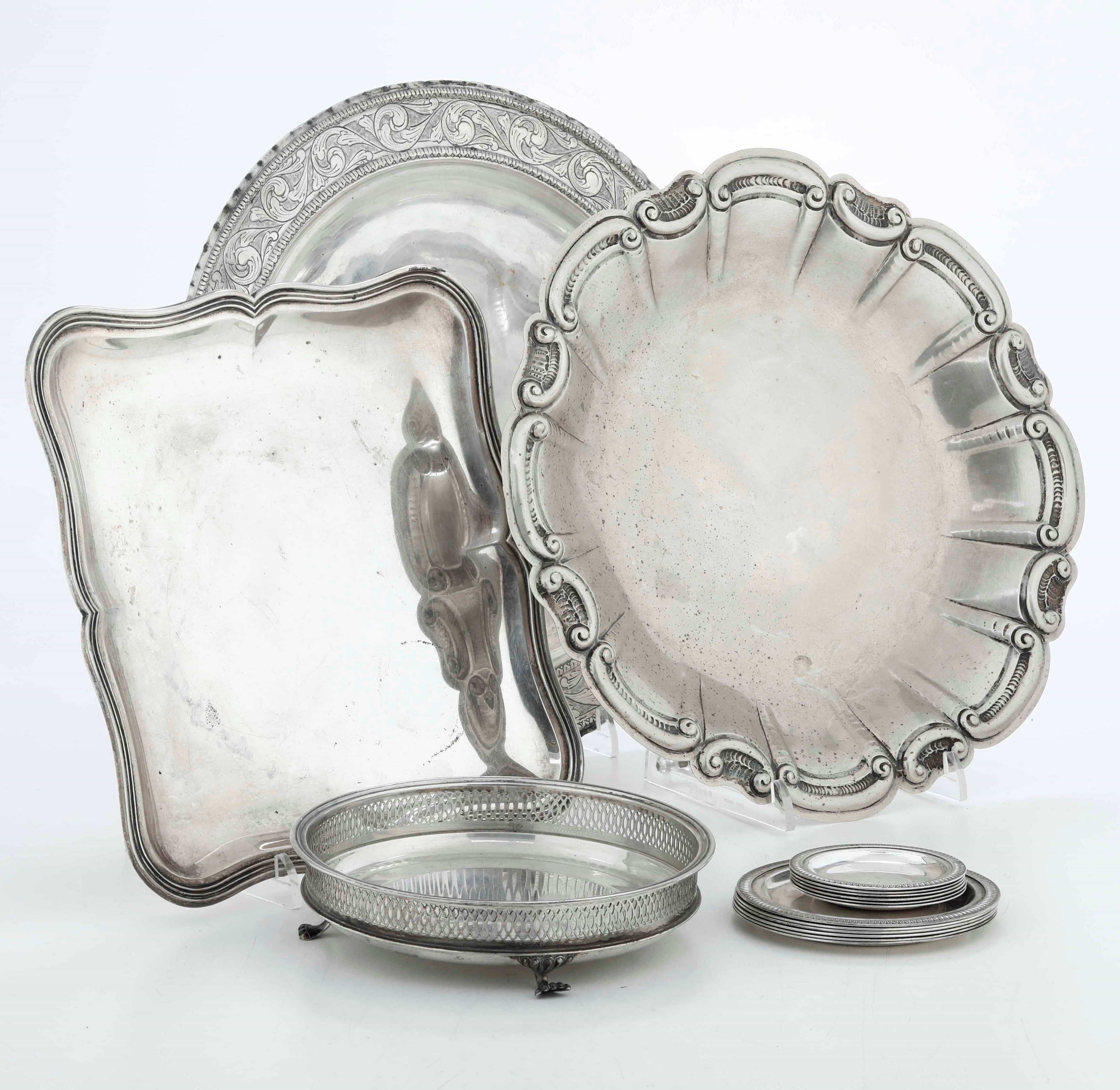 Lotto di tre vassoi, un'alzata e dodici sottobicchieri in argento. Varie manifatture [..]