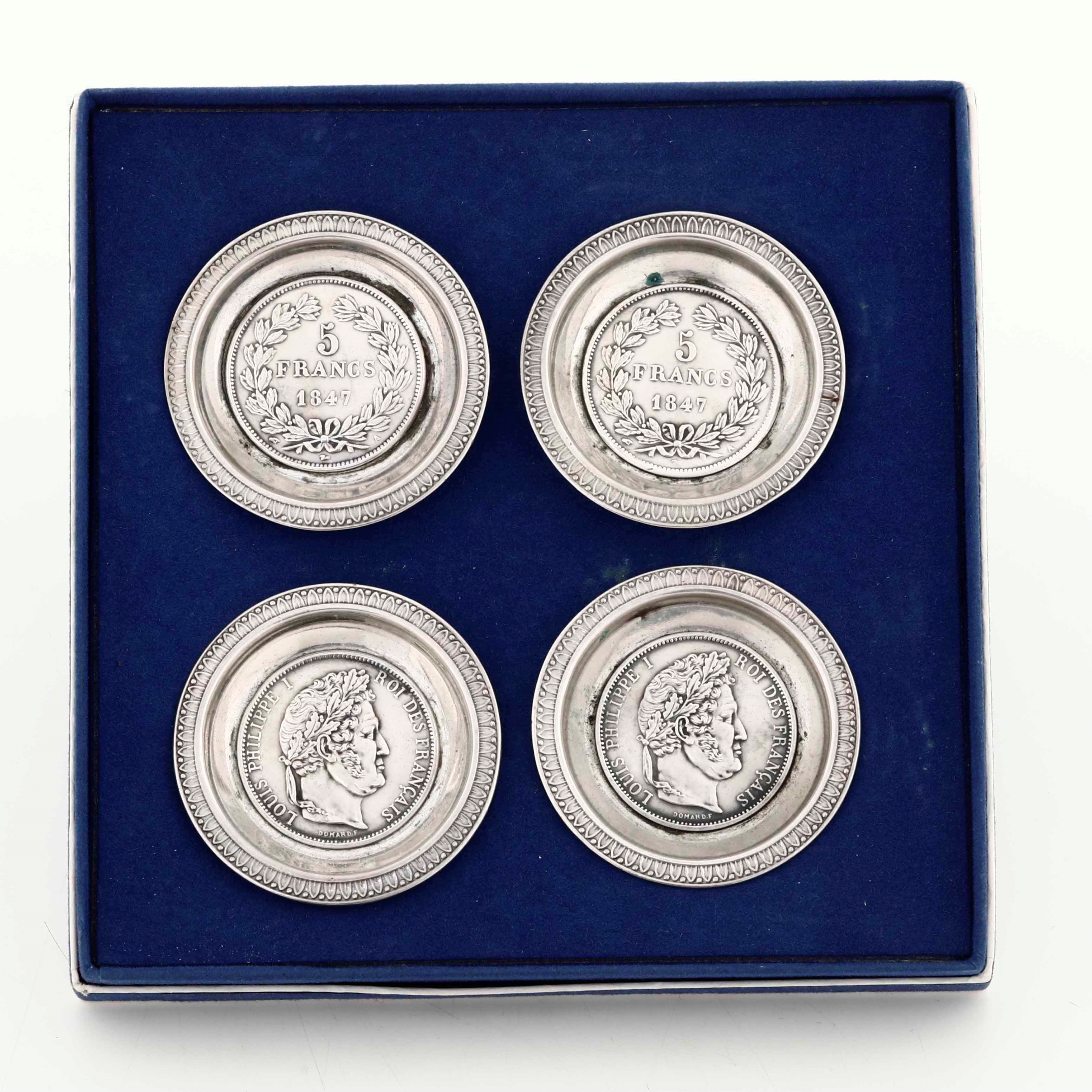 Quattro piattini con monete francesi in argento. XIX-XX secolo