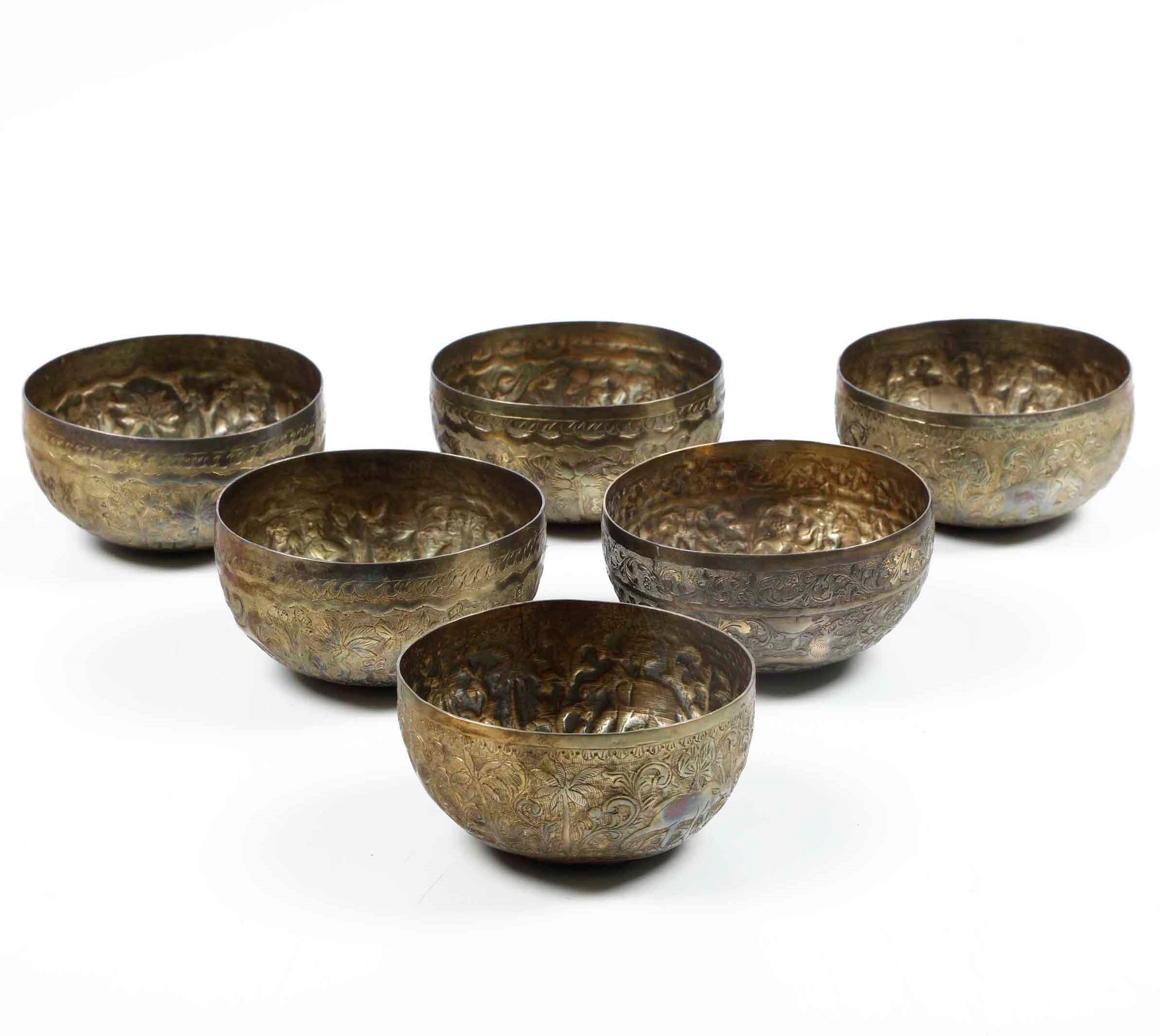 Sei coppette in metallo lavorato con scene di caccia
