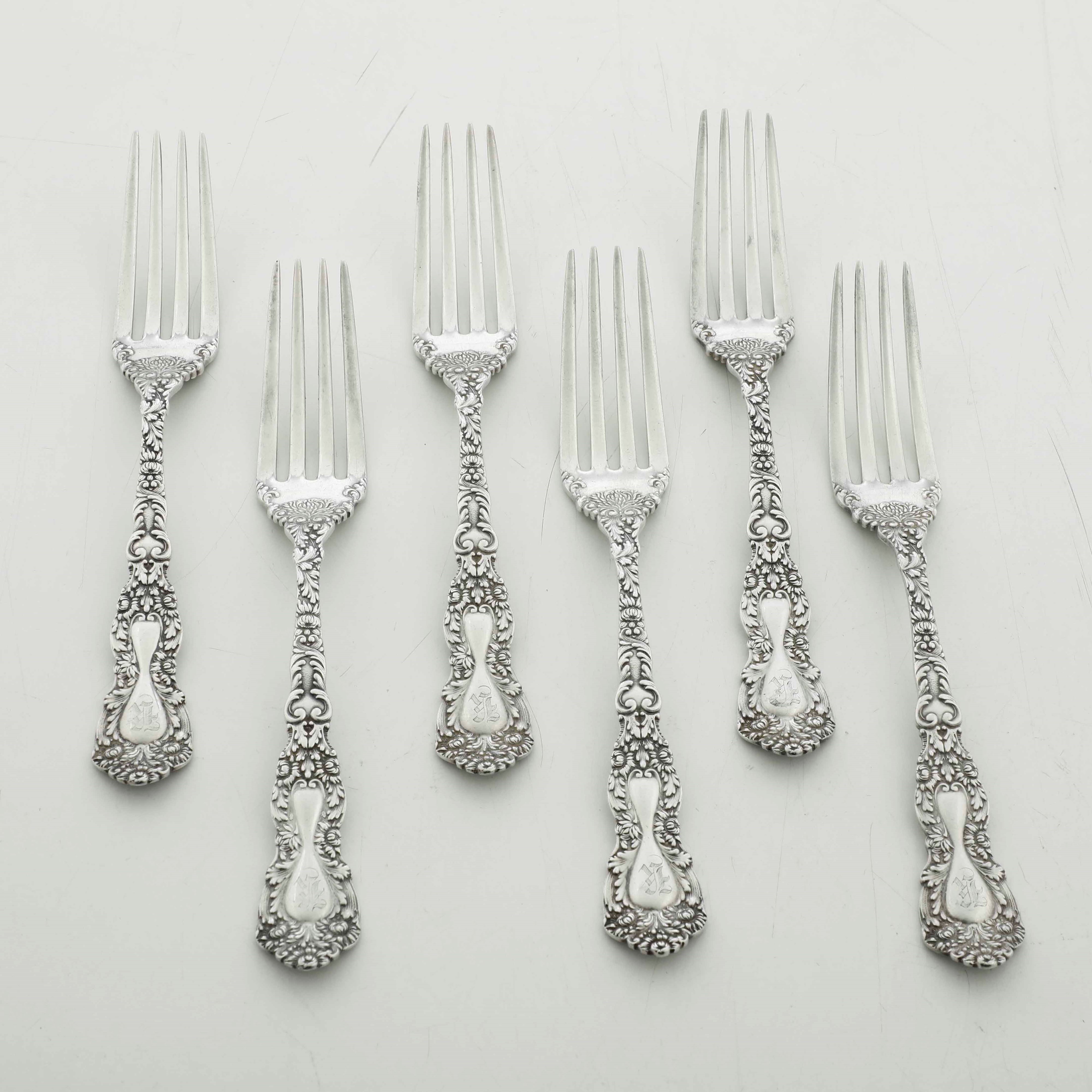 Sei forchette in argento fuso e cesellato. Gorham, USA 1880