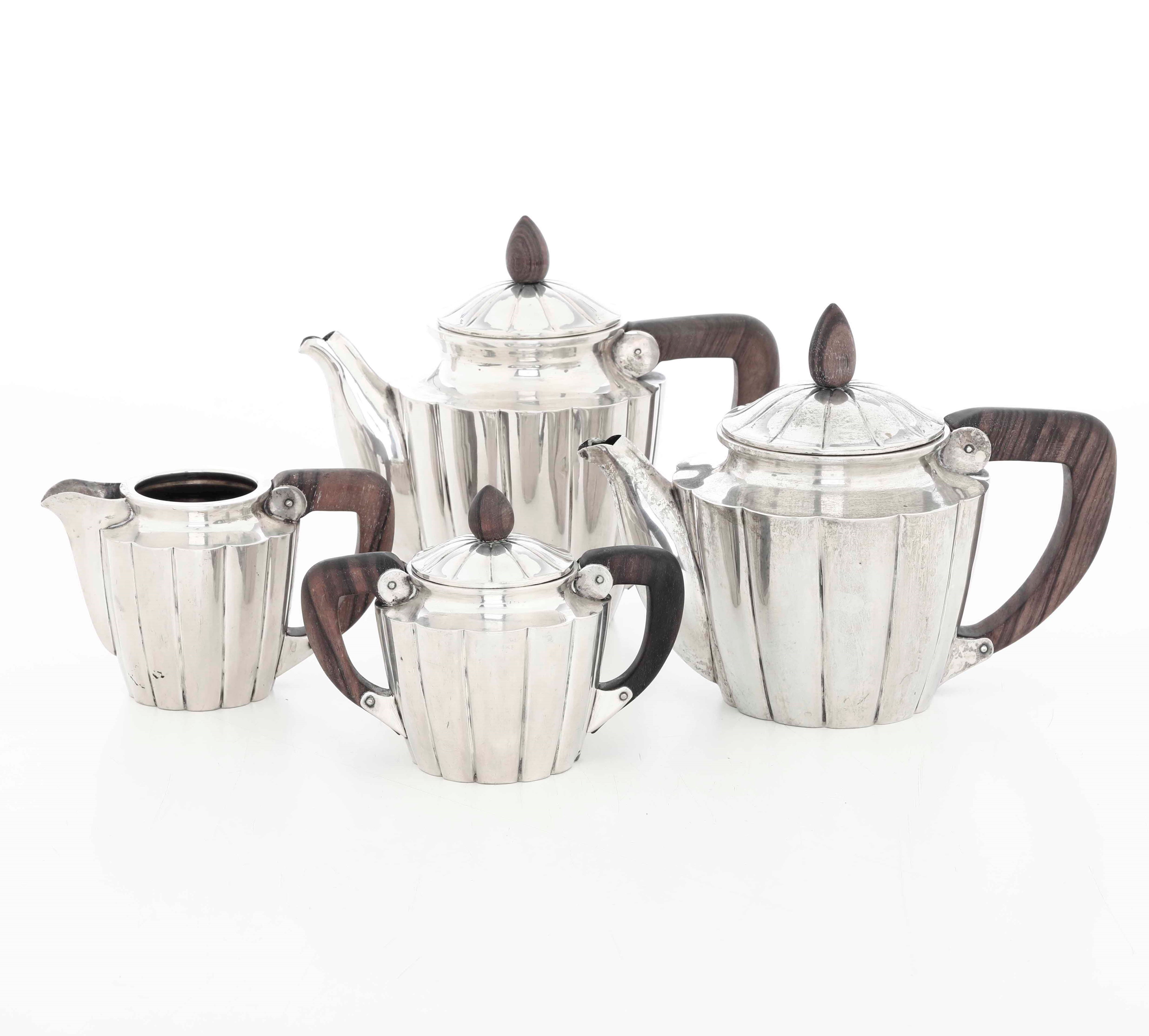Servizio da tè e caffè. Argento fuso, sbalzato e legno sagomato. Argenteria artistica [..]