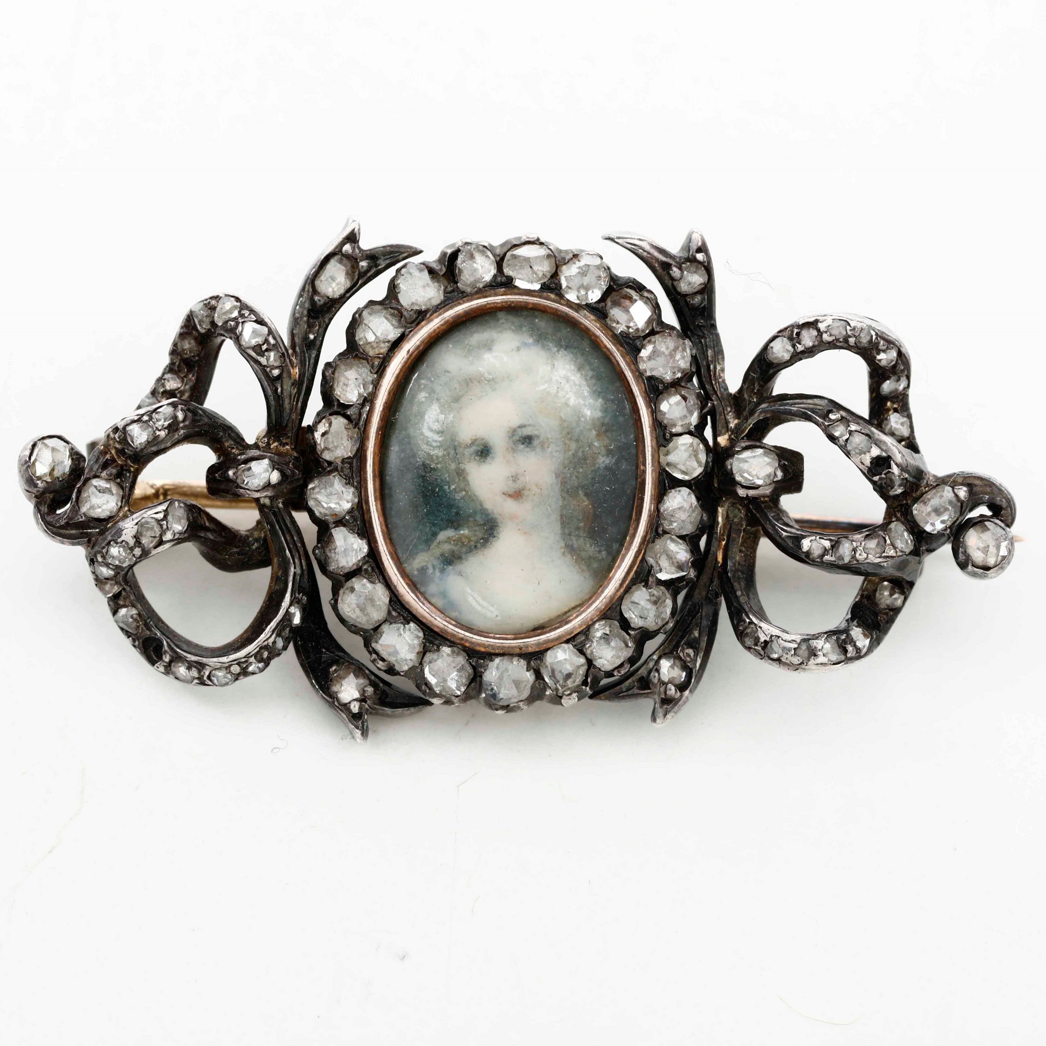 Spilla a fiocco con miniatura centrale. Argento e argento dorato e brillanti taglio [..]