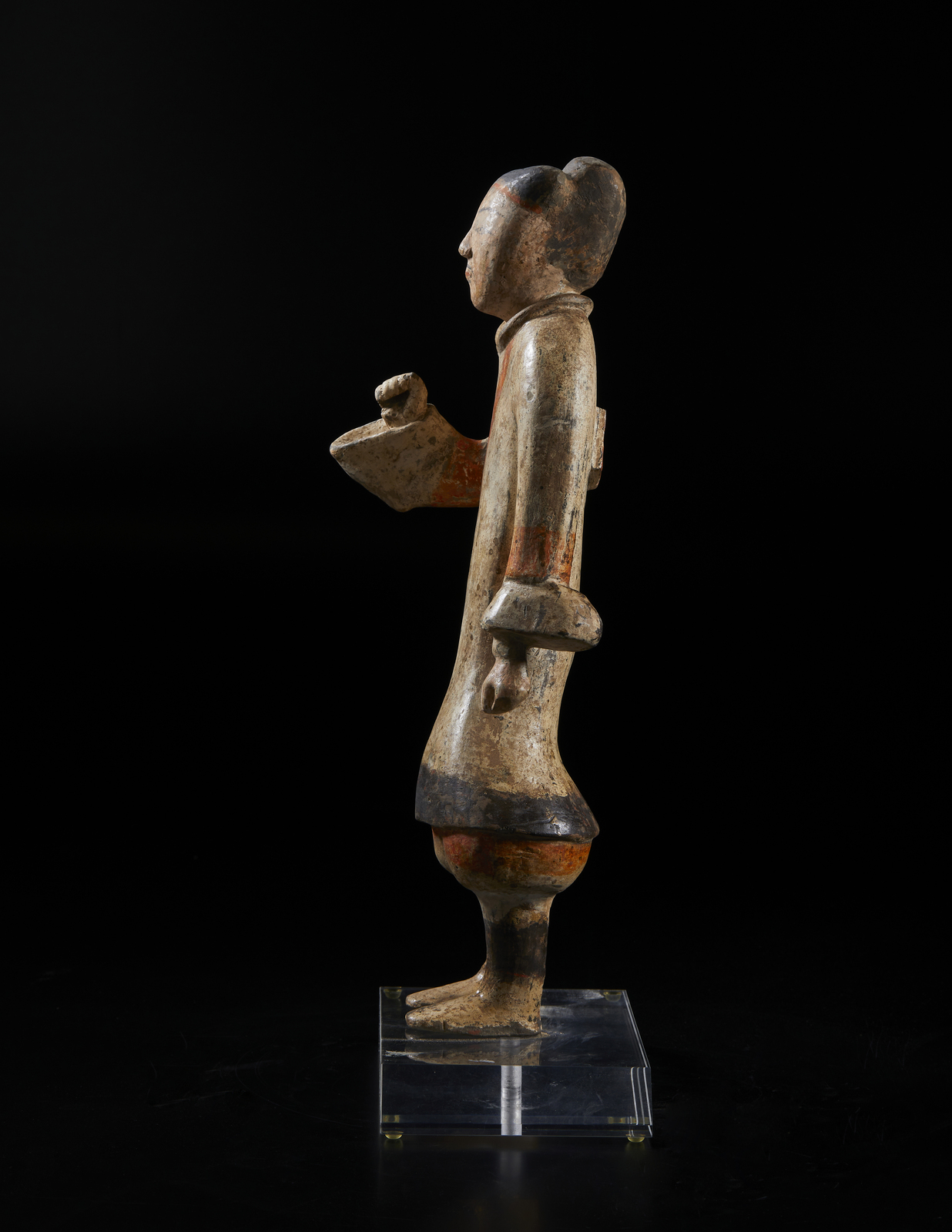 Poggiante su disco e con pareti dritte. l'interno con decorazione tratteggiata e a e scaglie di pesce incisa entro cartigli triangolari colorati in verde a formare una stella. Orlo superiore decorato a motivo di chevron. Per un esemplare comparativo cfr. Curatola, Ceramiche Persiane dal IX al XIV secolo, Skira 2006, p.98.