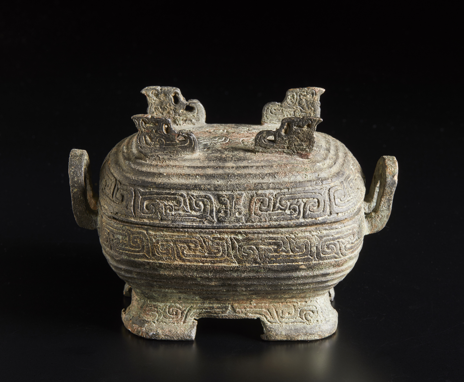 contenitore rituale per vino su modello di epoca zhou in fusione di bronzo a patina di scavo.