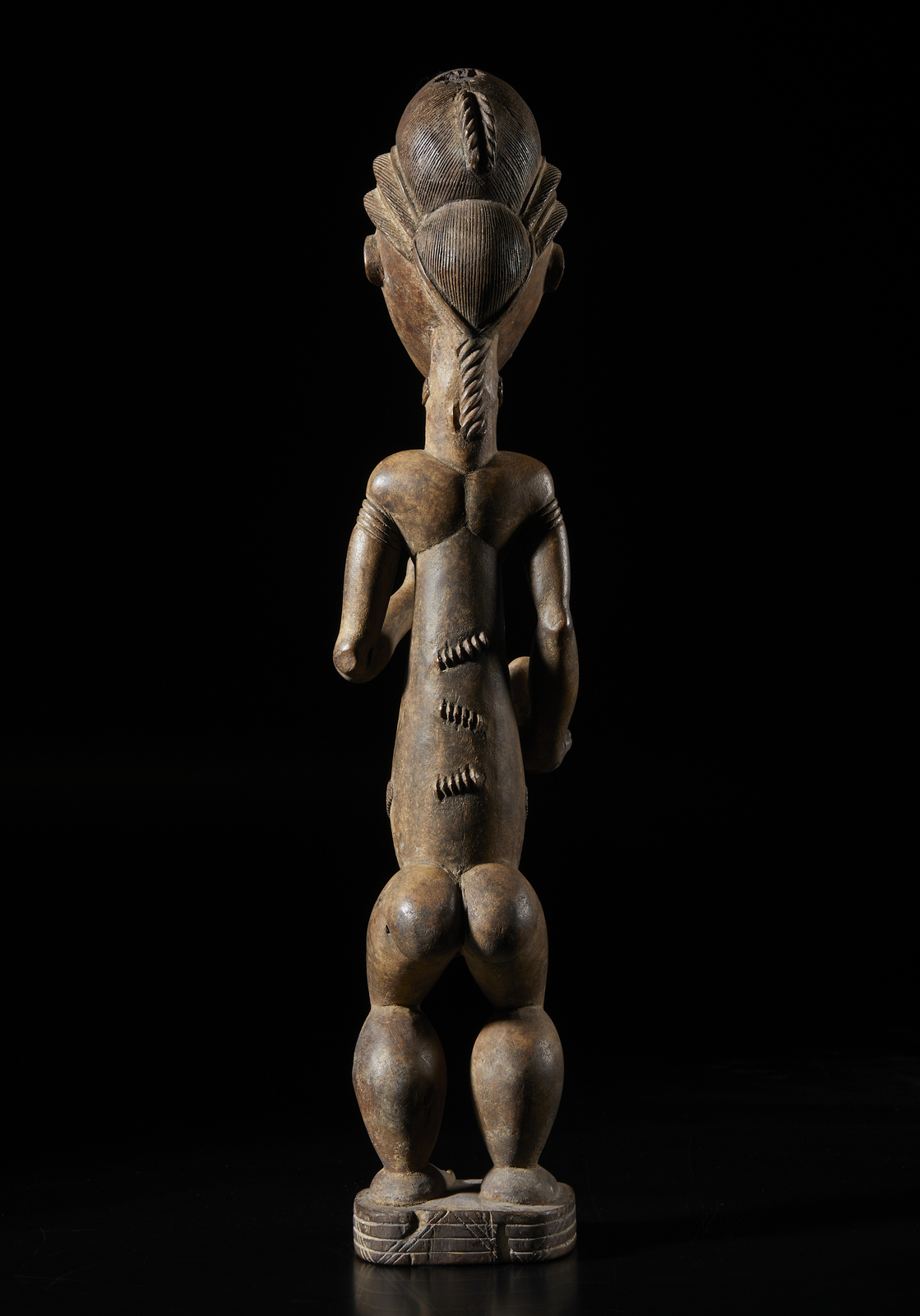 Piccola fusione in bronzo a patina scura raffigurante il bodhisattva della compassione nella sua versione a quattro braccia, seduto in padmasana su una base a doppio fiore di loto. Le due mani principali unite nel mudra della preghiera, le due secondarie recano attributi.