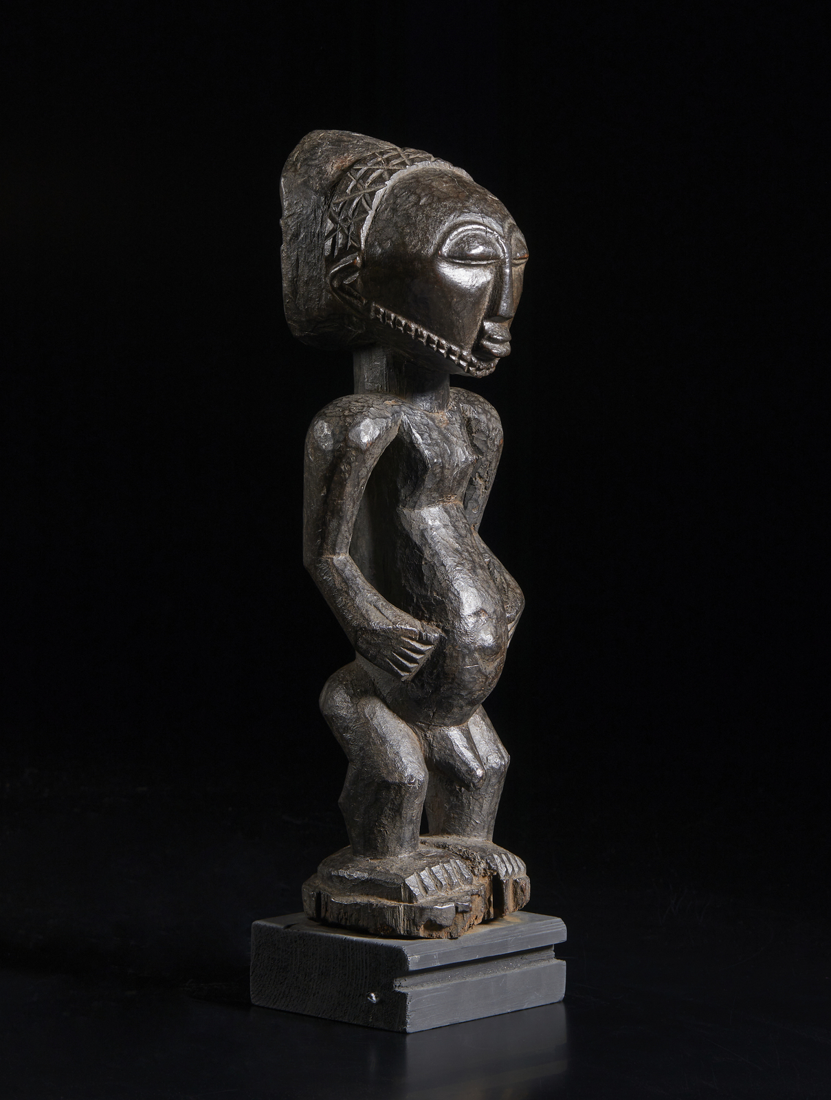 Scultura in pietra scura raffigurante la divinità stante su una base a doppio fiore di loto, circondata da una prabha a ferro di cavallo e probabilmente affiancata dalle personificazioni dei suoi due attributi principali. La figura indossa vesti e gioielli regali ed è sormontata da due piccole figure in atteggiamento devozionale. Figura di orante inginocchiato alla base, mancante all'angolo opposto. La sobria decorazione della prabha trova un esemplare comparativo nel Chazen Museum, Wisconsin, USA, Acc.no. 1972.27.Misure con base: 62,5 x 39,5 cm