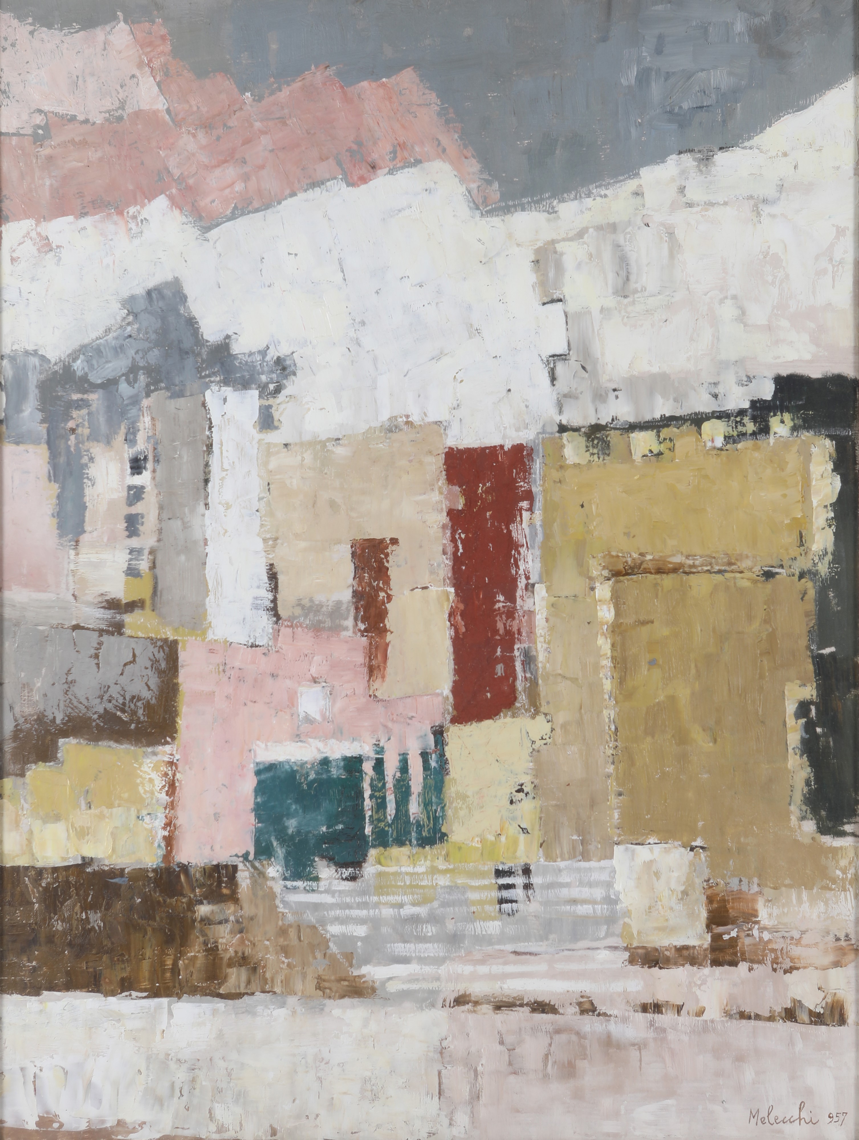1957 Firma in basso a destra Melecchi '957. Al verso reca etichetta del Ministero dell'Interno Premi Artistici e della Cultura. Misure in cornice cm 96,5x76,5