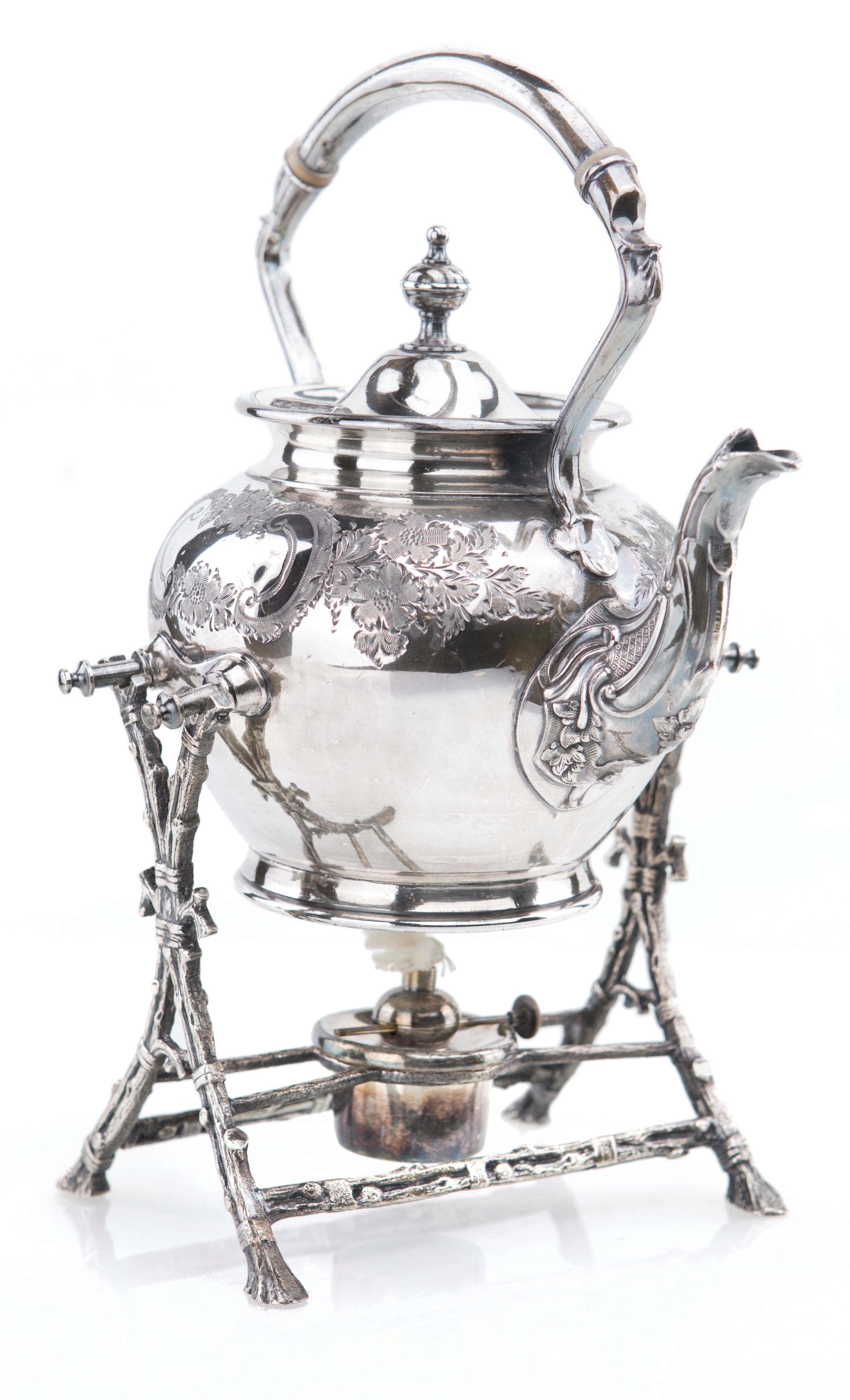 Antica teiera con fornello in metallo argentato