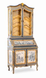 cm 210x88x44 con profili giallo ocra e pannelli decorati da paesaggi di gusto orientale in monocromia blu; corpo [..]