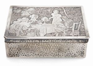 cm 3,8x11,7x8,5 a superficie martellata e coperchio incernierato decorato da una scena di genere ambientata in [..]