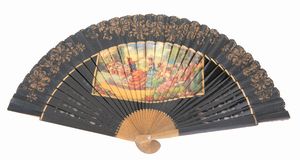 cm 27x45 con stecche in avorio arricchite da tralci dorati; pagina in carta doppiata in seta, decorata all'acquerello [..]