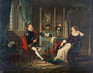 olio su tela, cm 50x63 - in cornice: cm 64x76 Piacevole raffigurazione di un gentiluomo intento ad allietare una [..]