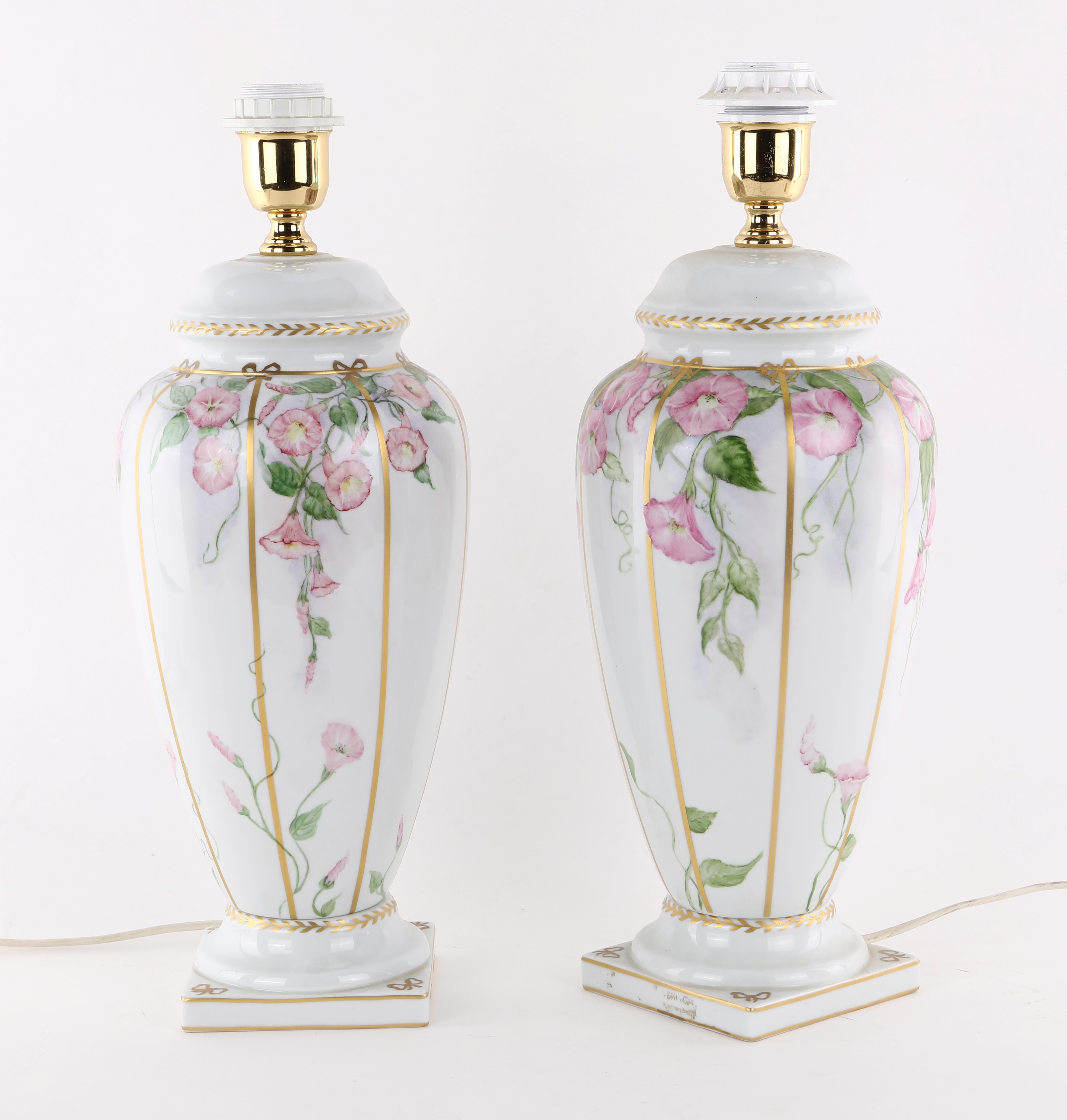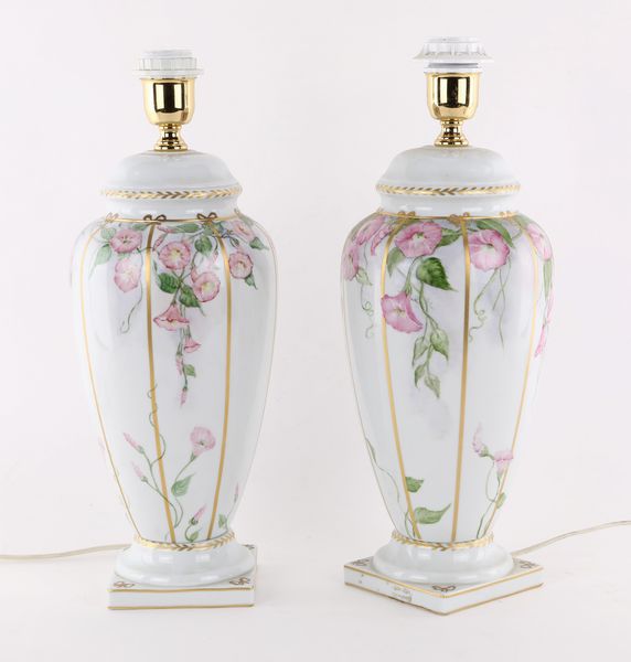 decorate da tralci con convolvoli rosa entro partizioni delimitate in oro; complete di paralume