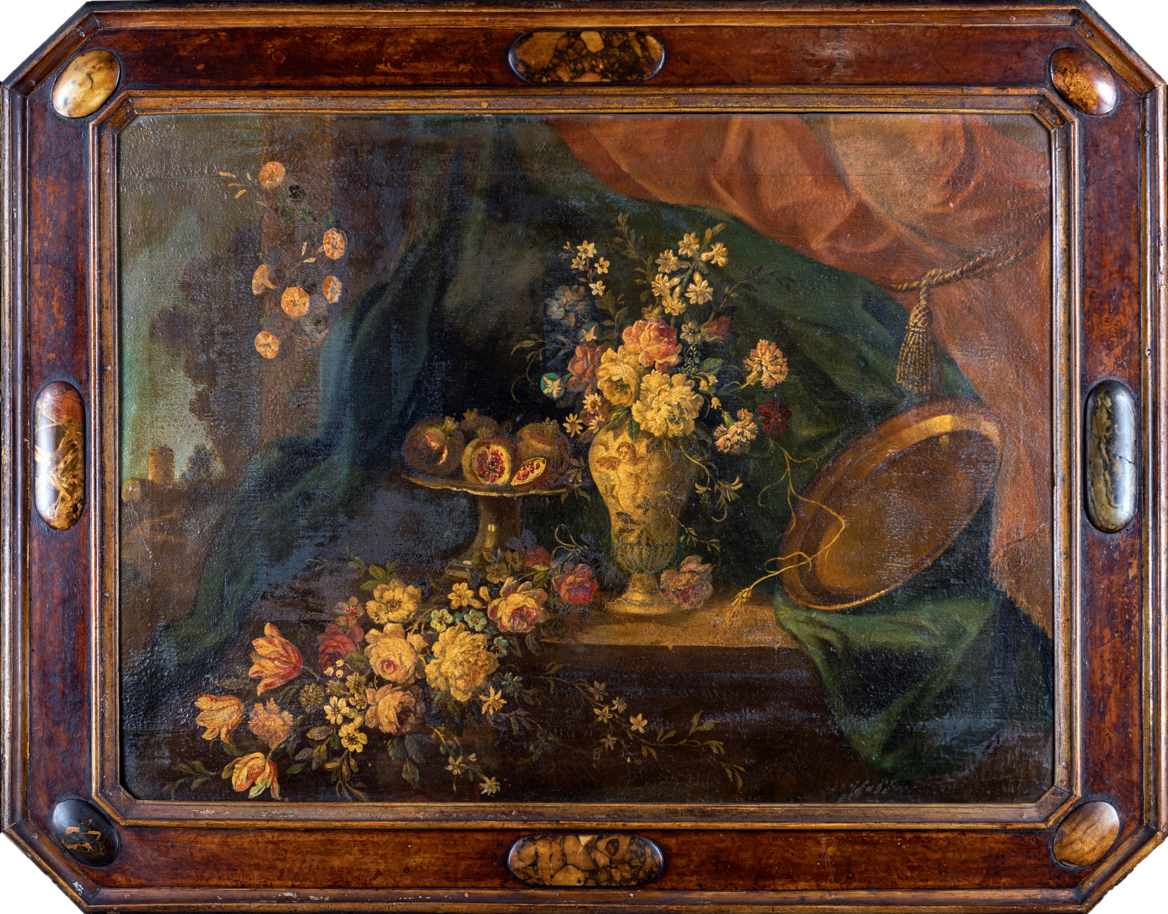Natura morta di fiori e melagrane