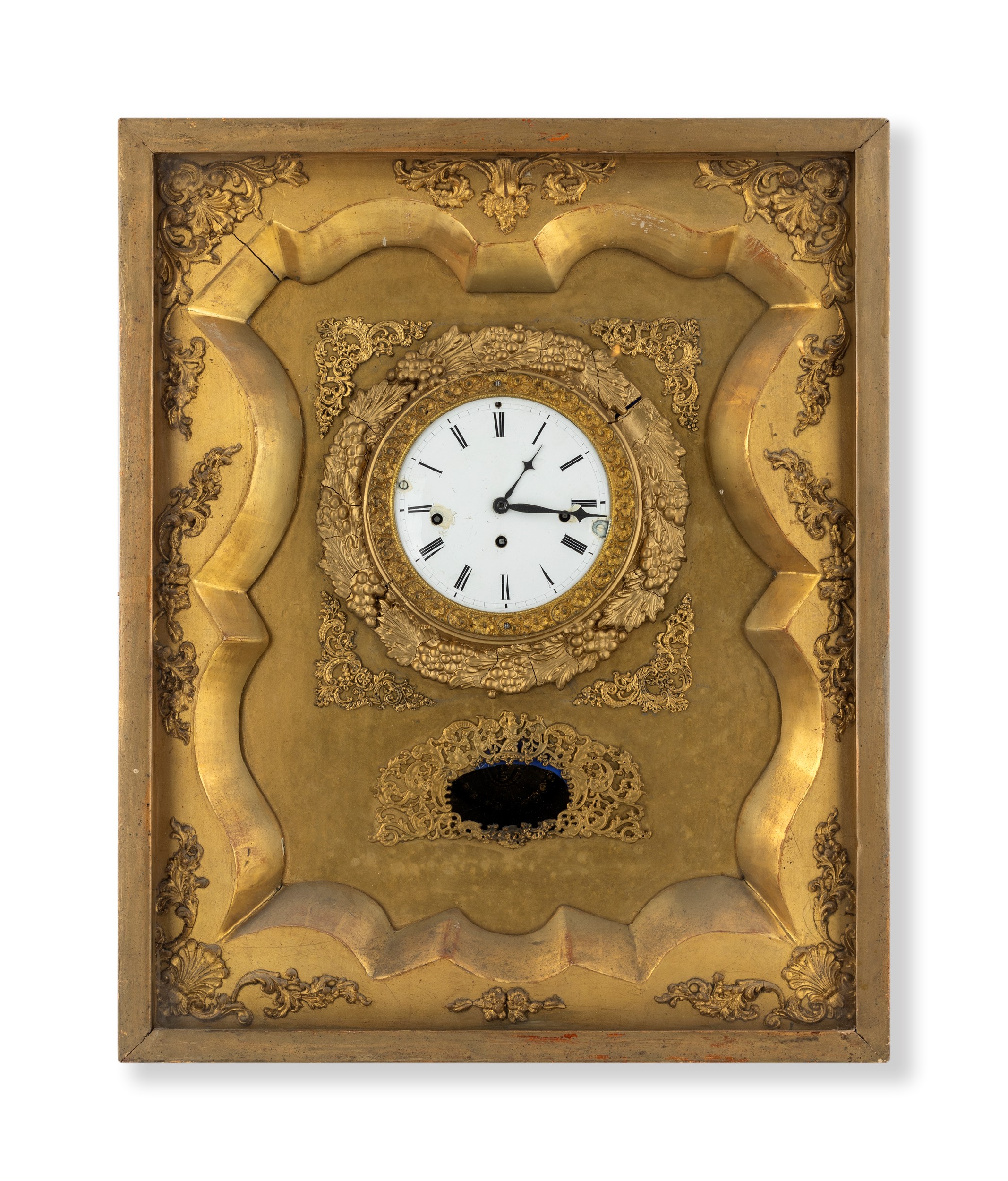 con cassa a vassoio impreziosita da rilievi ornamentali naturalistici in pastiglia; quadrante circolare in smalto bianco a due fori di carica e fascia oraria a numeri romani.