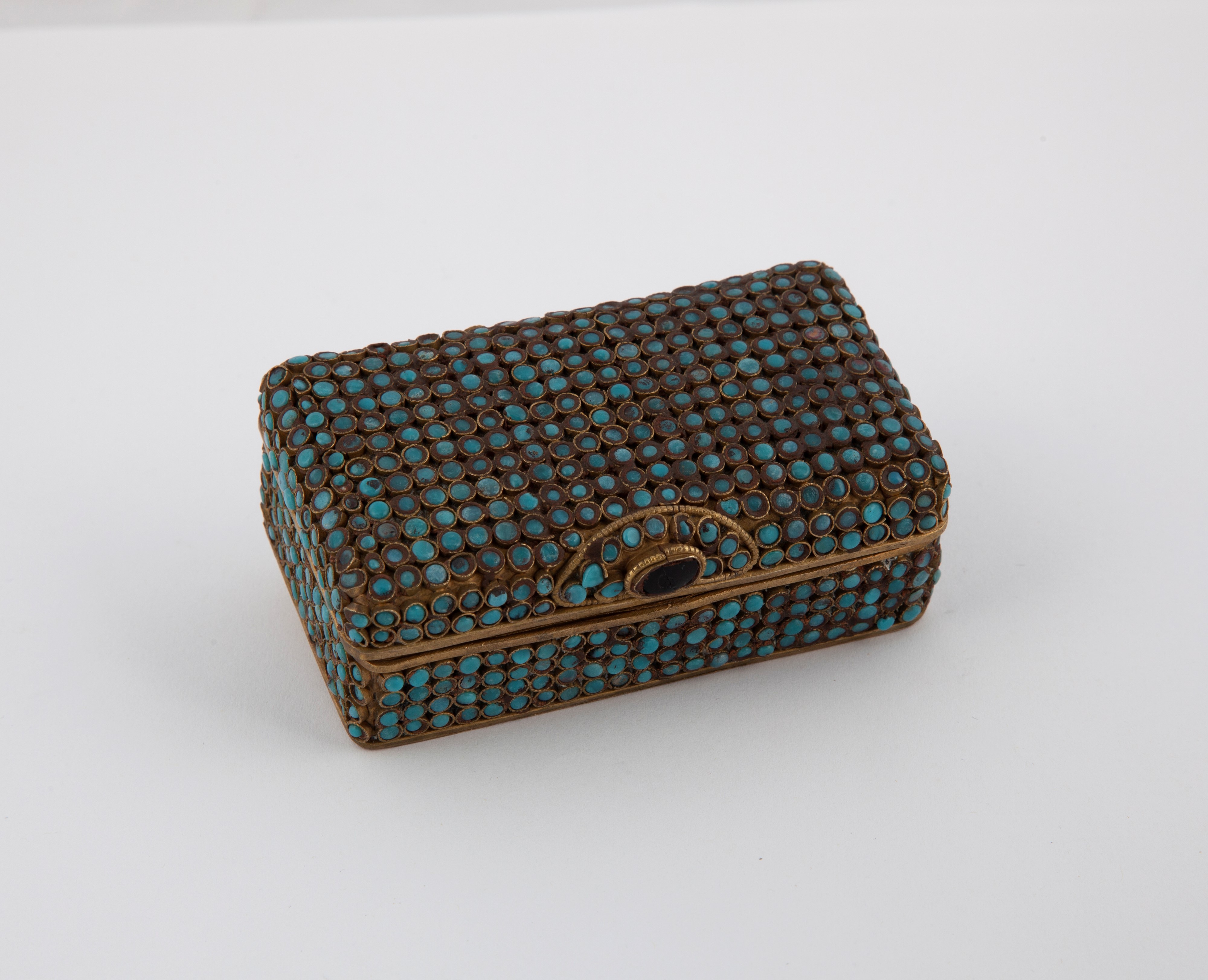 interamente decorato da piccole gemme turchesi racchiuse in castoni circolari; coperchio incernierato con apertura a scatto ornata da una pasta vitrea rosso granato