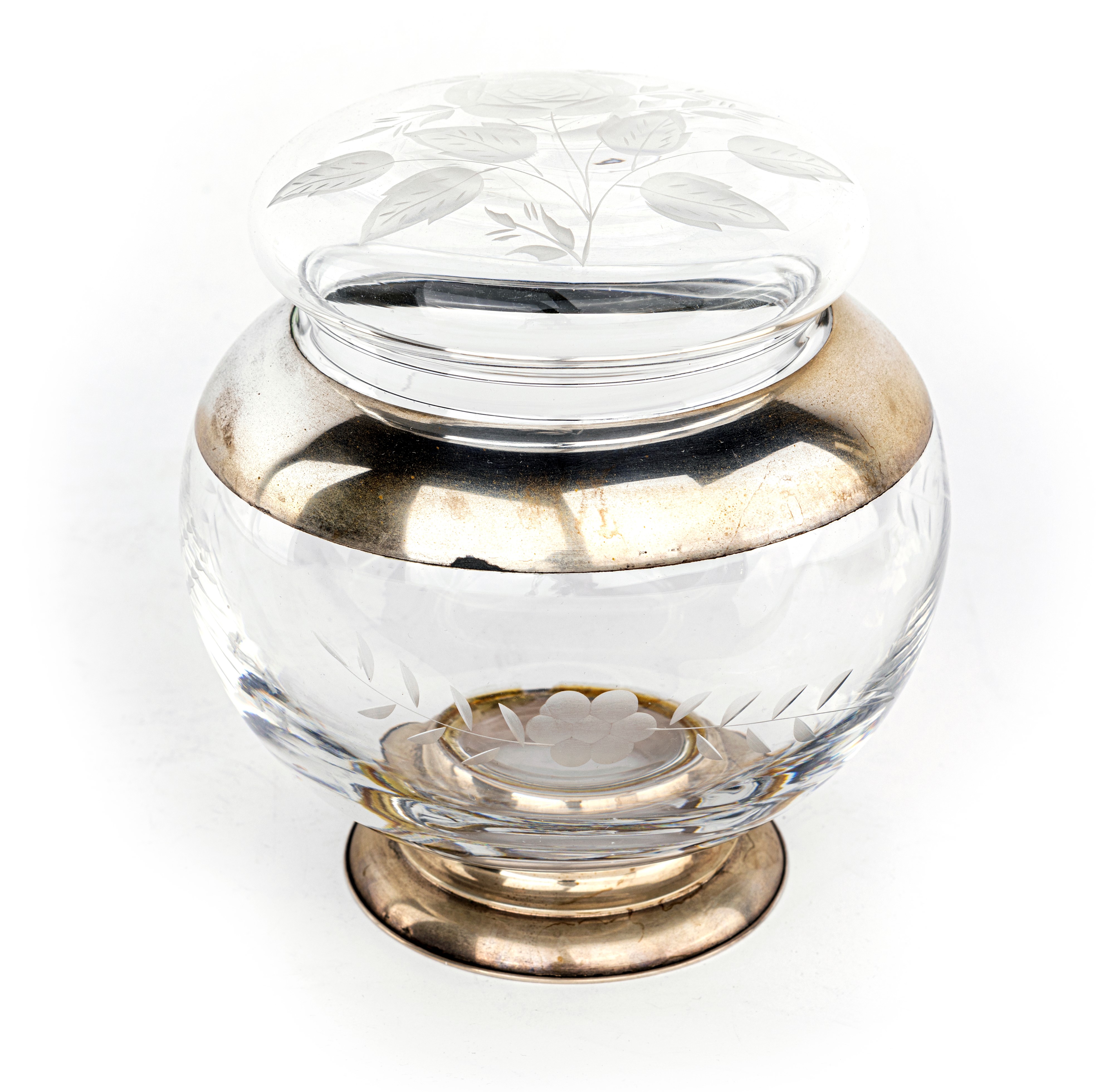 di forma sferica su basso piede in metallo argentato; coperchio decorato da un ramo di rosa inciso