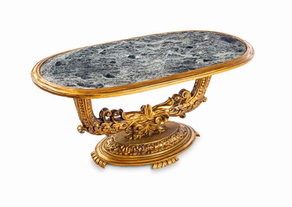 con piano ovale incassato in marmo verde, sorretto da due bracci incurvati contrapposti, abbelliti da rilievi naturalistici intagliati; base ovale